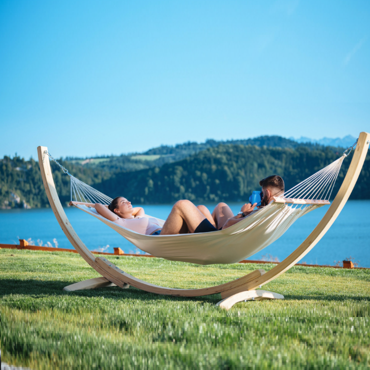 Takket være den kompakte størrelsen trenger du ikke å ha en hage for å nyte hvile - bare en terrasse eller balkong. Trekonstruksjonen er slitesterk, og produktet er enkelt å montere og eventuelt demontere – hvis du bestemmer deg for å gjemme det til vinteren eller ta det med deg på ferie.