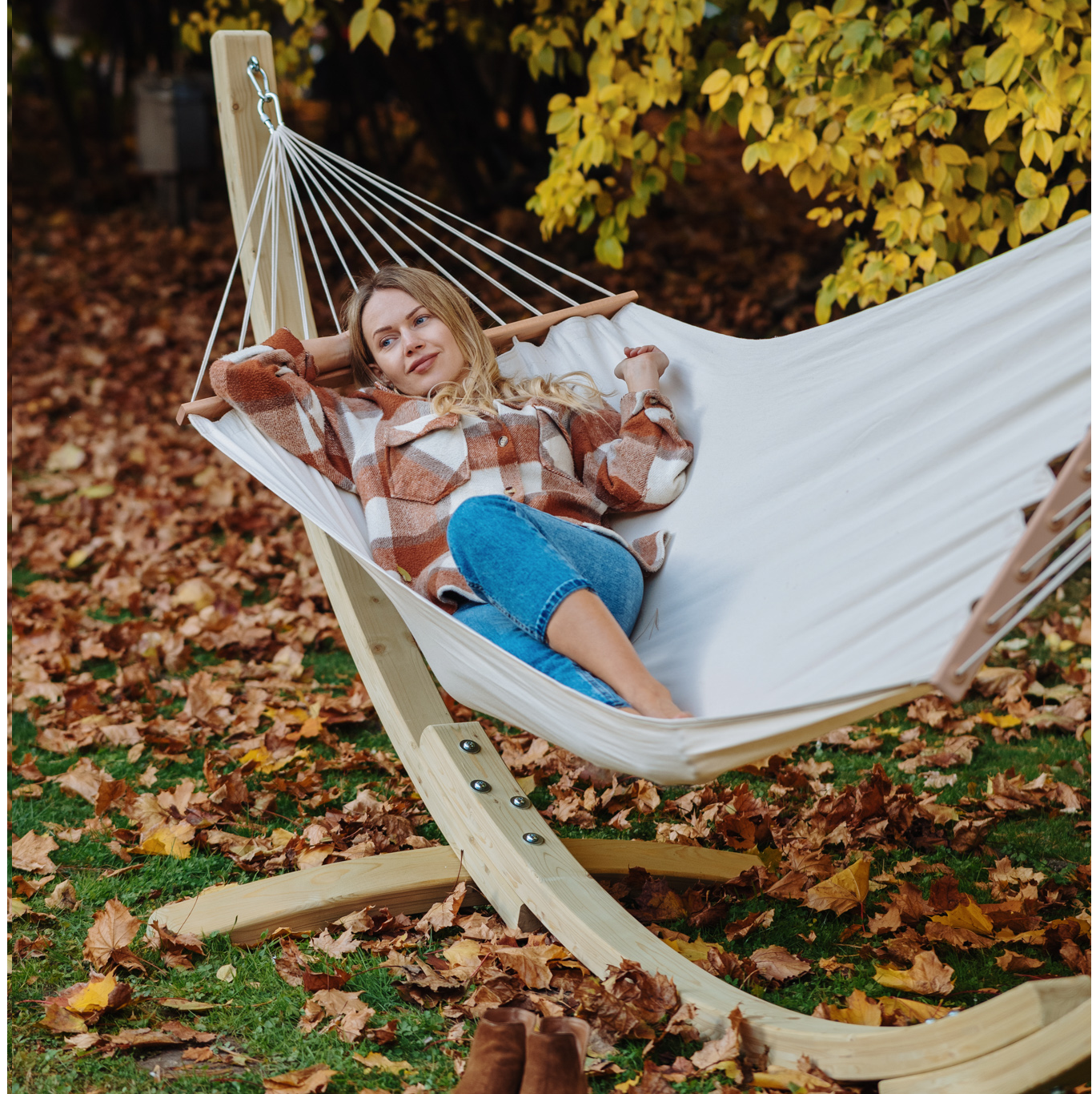 Treet som stativet er laget av kommer fra kilder som ikke påvirker skogens vitalitet og organismer som lever i dem. Dette fremgår av Forest Stewardship Council (FSC®) sertifikat. Bomullsmaterialet i hengekøyen er behagelig å ta på og er preget av holdbarhet.